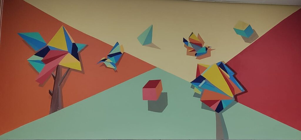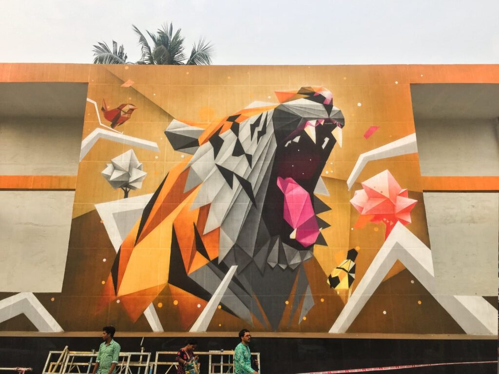 It’s inexpensive, easy to apply, and covers large walls quickly — perfect for backgrounds and block colours. Many muralists roll on latex bases to create smooth, adhesive surfaces before layering their spray designs.